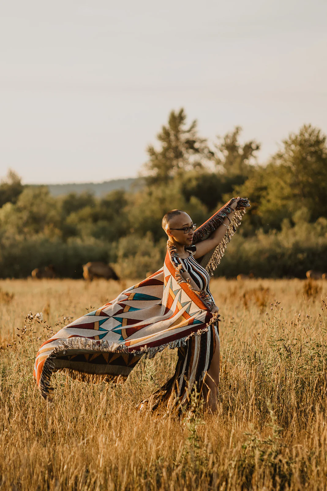 Blackfeet/Piikani artist and Inspired Natives® Collaborator John Isaiah Pepion drew inspiration from the butterfly designs that flit across the rawhide parfleche designs of the Plains Indians. Traditional parfleche are beautifully embellished rawhide containers, decorated by painting, incising, or both. This unique throw blanket is a beautiful modern interpretation of these traditional designs, wrapping the wearer in a wish for good dreams and untroubled sleep.