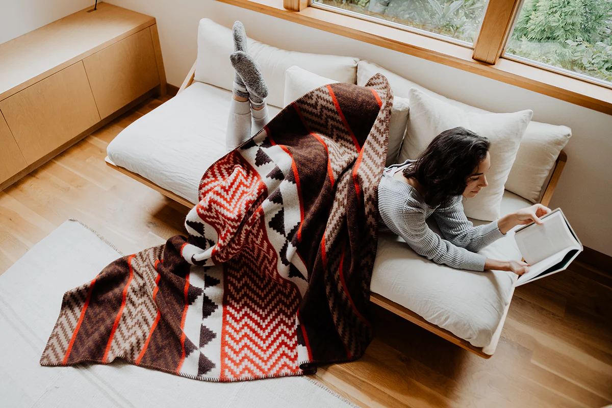 The land of glacial fjords and snowy mountains, Norway has a long history of wool textile production. For our North Winds Series, we have partnered with a Norwegian mill specializing in sustainable practices and heritage techniques to produce this special series of Native designed, 100% wool blankets, fusing traditional wool textile knowledge from two ancient traditions with two modern companies working to keep cultural art thriving. This unique partnership allows us to work with a small mill that, like Eighth Generation, values sustainability and cultural practices, while sharing Indigenous art and excellence with Nordic partners. As a vertical mill, all parts of the wool blanket production takes place in the same area—the sheep are raised and tended, the wool sheered, processed, and spun into yarn, and the blankets woven in one sustainable operation. These luxurious, 100% wool blankets are of a thick, heavy weight, perfect cuddling under while you watch the snow fall outside your window.