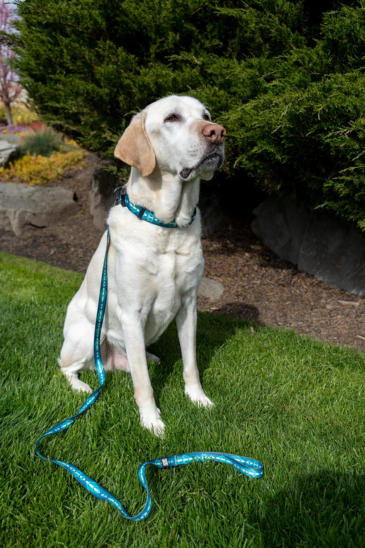 In shades of teal blue, Sarah has surrounded a daybreak—the New Day—with symmetrical, geometric loom designs. The result is a flowing line of warmth, positivity, and love flowing from your hand at the leash's handle down to where it connects to your pup. "We have always made and given art to those we love," says Sarah, "and now we can share art with our four-legged best friends. My old rez dog Neptune and my new rez puppy Choco stand out at the dog park when walking with their New Day Leashes."