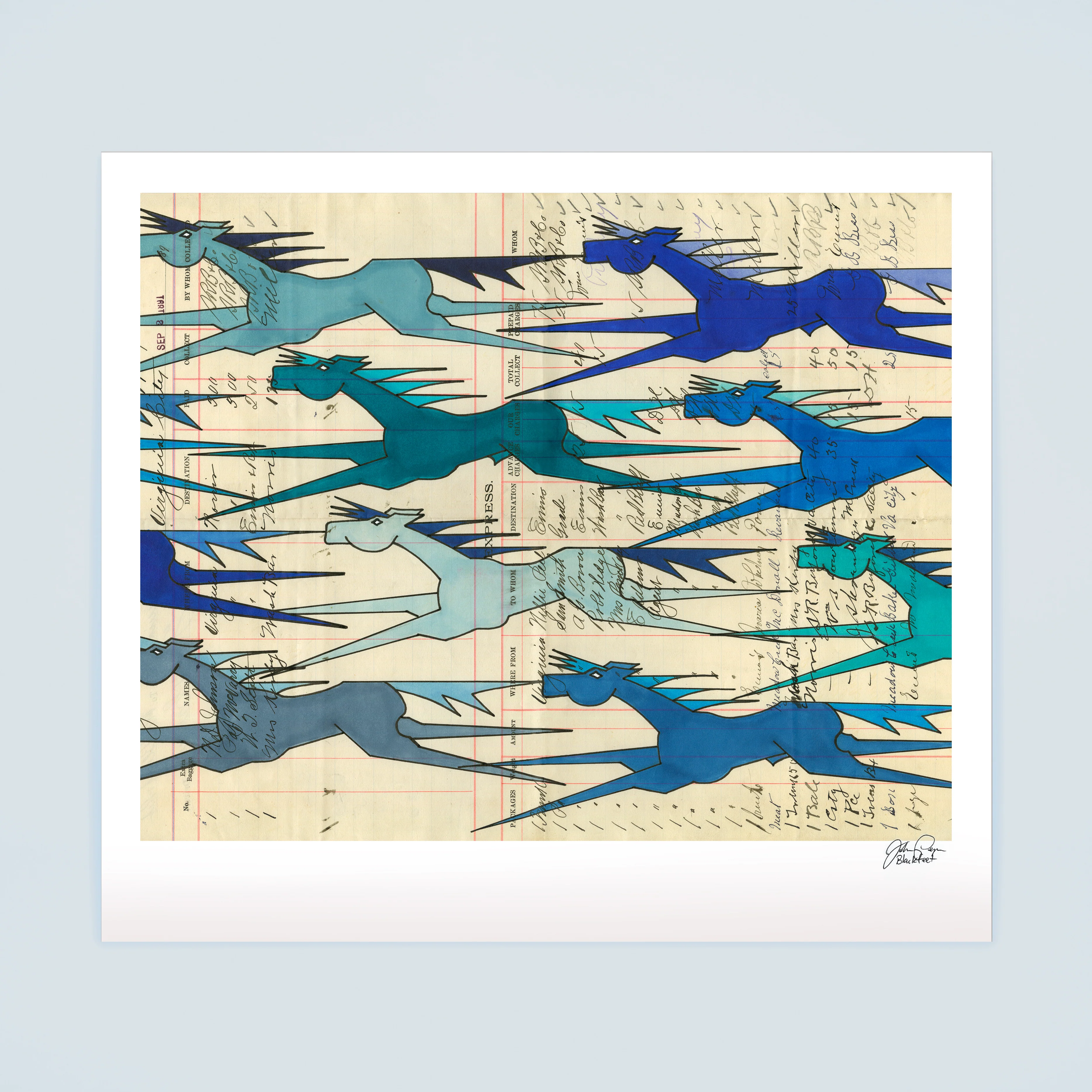 Ten blue horses streak across the page in the Pony Express Fine Art Print by Piikani/Blackfeet artist John Isaiah Pepion. In nineteen shades of blue—from aqua to azure—these horses pay tribute to the horse culture of the Plains people.