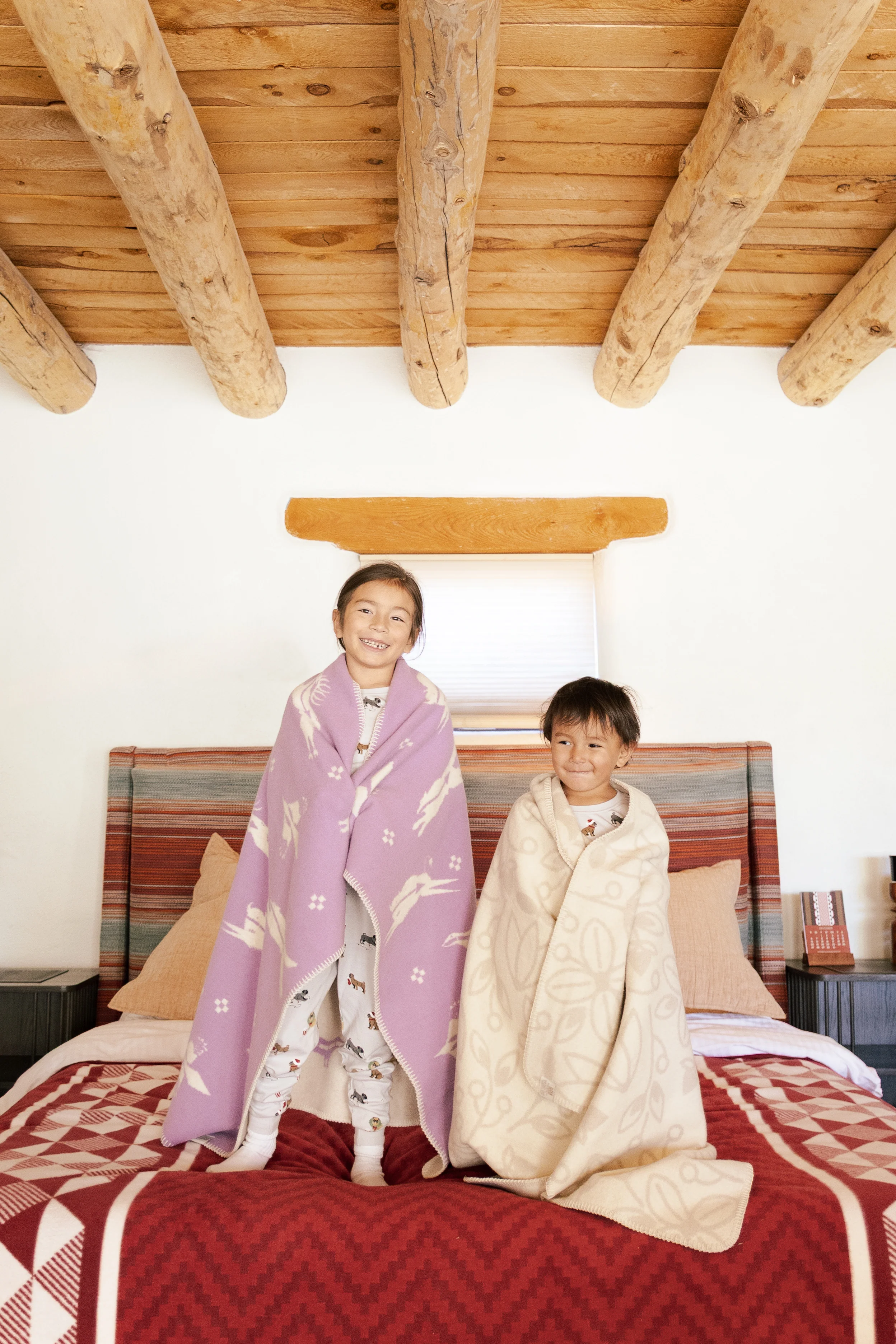 In Blackfeet culture, powerful animals like the buffalo, wolf, and elk are often called upon in song and ceremony for protection. Artist John Isaiah Pepion (Piikani/Blackfeet) has woven the sacred buffalo, elk, wolf, otter, magpie, and beaver into his Protection Baby Blanket. An arrow fills the body of each animal, representing the lifeline or sacred breath each one carries. Made from a cotton/wool blend, John's blanket is the perfect merge of warmth, durability, breathability, and comfort. Woven in tradition and beauty, wrap your baby in love and protection with our Protection Baby Blanket.