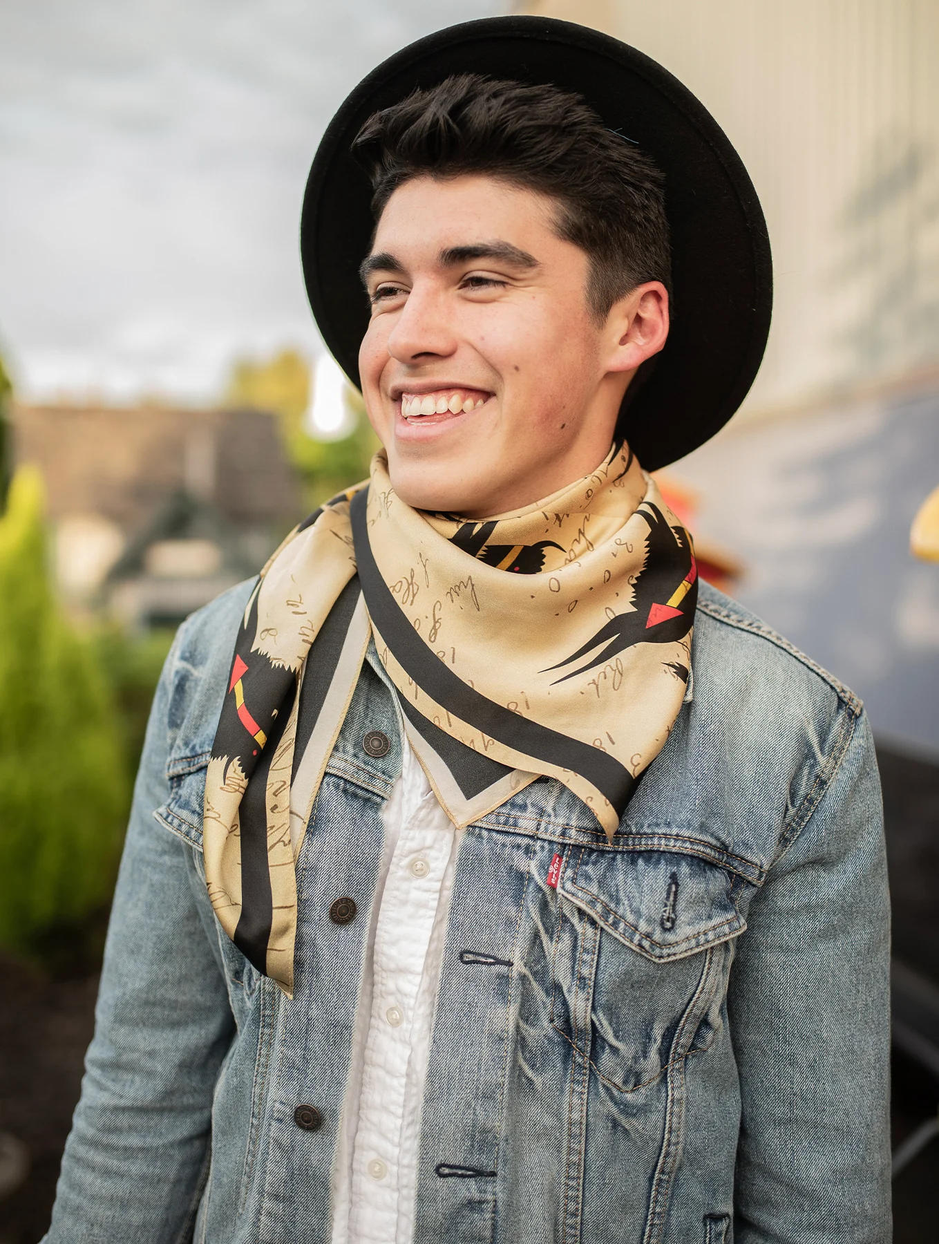 This beautiful scarf features the signature ledger artwork of Blackfeet/Piikani artist and Inspired Natives® Project Collaborator John Isaiah Pepion.