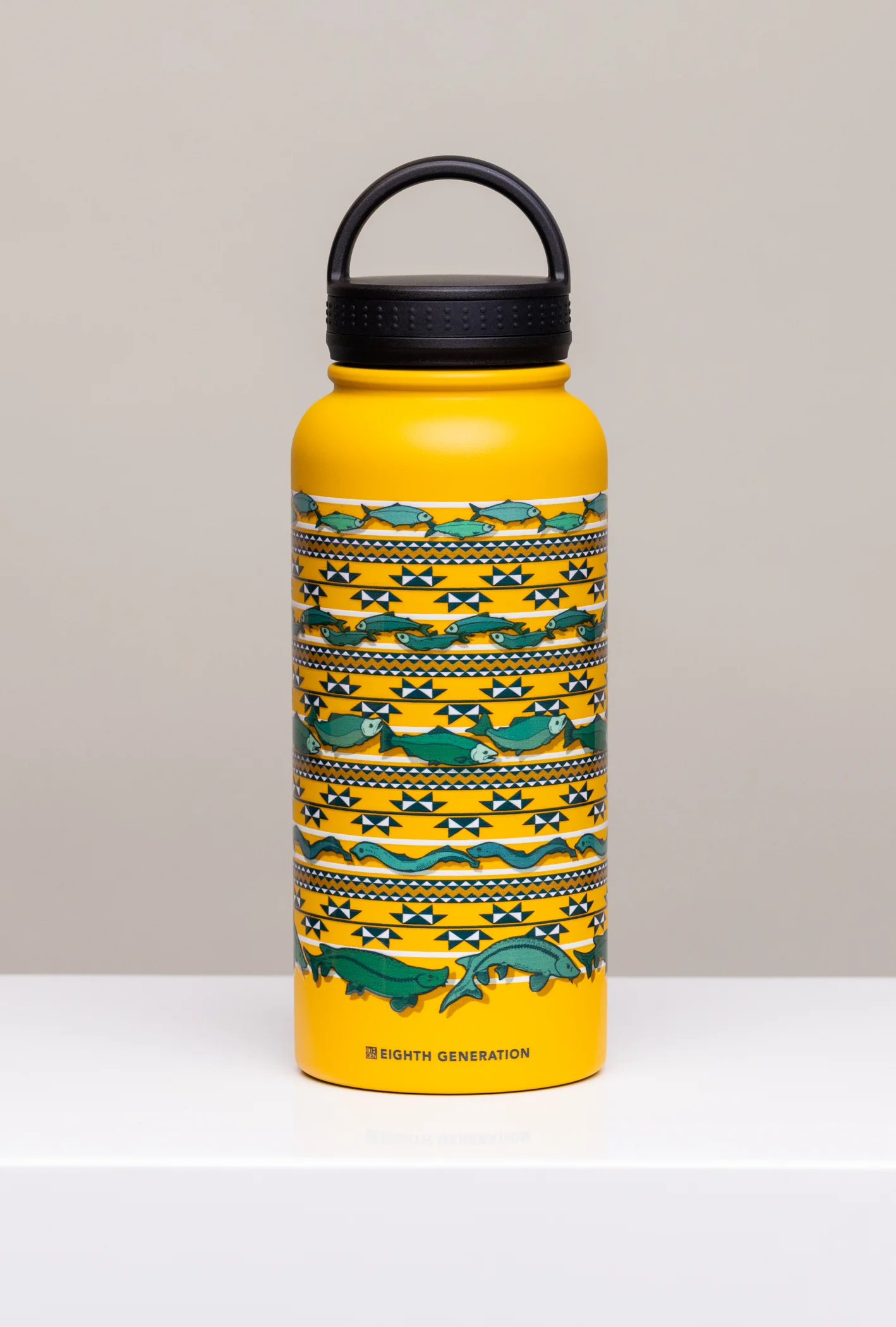 Chinook salmon, smelt, white sturgeon, herring, lamprey: these five fish have special significance. "Obviously all fish are important," shares Shirod Younker (Coquille/Miluk Coos/Umpqua), designer of our Traveling Waters Water Bottle, "but the five shown on the Traveling Waters Water Bottle are a few that are important to the survival of my people." Most of us are familiar with salmon and herring, and perhaps even smelt and sturgeon, but the surprise addition to Shirod's design is the lamprey. This ancient fish (scientists estimate lampreys are over 400 million years old!) is endangered here in the Pacific Northwest, and is an important food source to many area tribes.